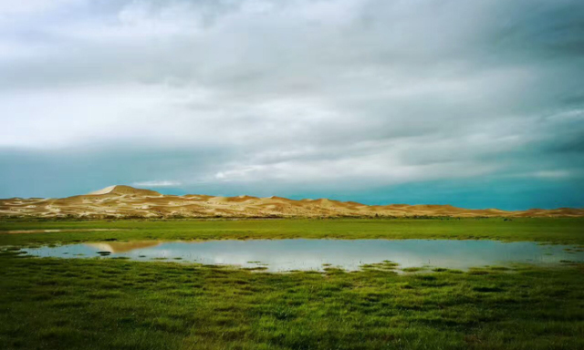 經(jīng)過小半程的徒步,會遇到一座極高的沙丘,翻越沙丘后豁然開朗。你會驚訝于沙漠的洪荒世界居然有如此的世外桃源,寧靜的湖泊被浩浩蕩蕩的綠洲包圍著,湖畔生長著沙漠腹地極罕見的小樹林,生機盎然。