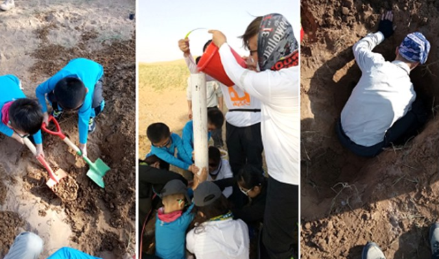 沙漠湖畔,是打井的理想之地,齊心協(xié)力挖沙,很快就會有地下水滲出,輕輕松松收集三大桶水。收集好了水,然后上道具,塑料管、乒乓球還有大朋友小朋友的齊心協(xié)力,沙漠甘泉游戲,搞定。