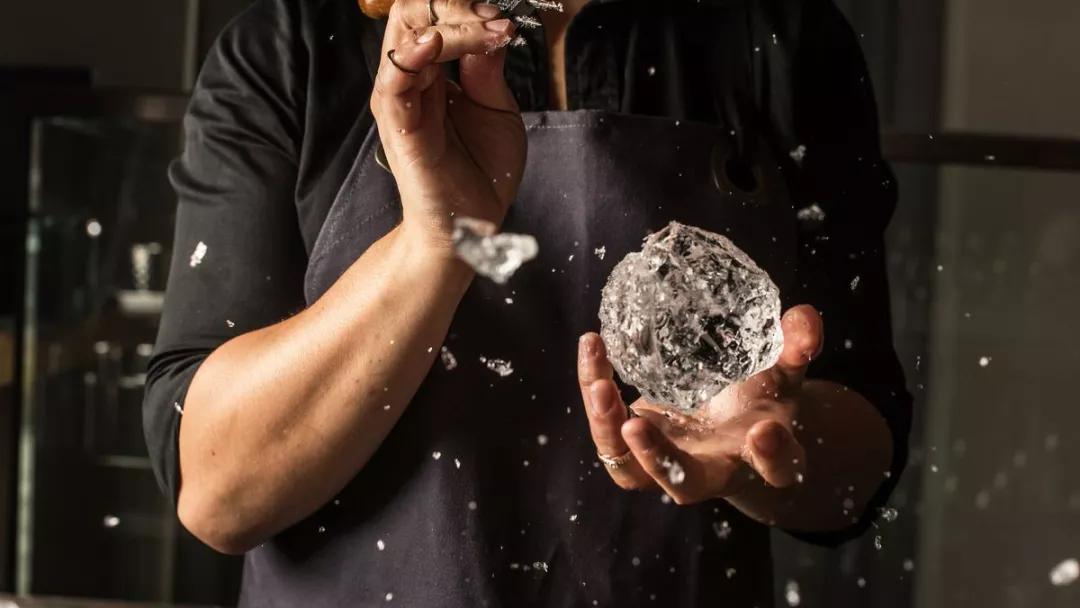 當(dāng)然,注重內(nèi)在的同時(shí),也不能忽視了外表。冰除了可以冷卻、稀釋酒,平衡口感外,還璀璨異常!手工雕琢的冰塊,可胖可瘦,可高可矮,形狀可以千奇百怪。切成鉆石形狀的冰,在燈光下晶瑩透亮,美輪美奐。