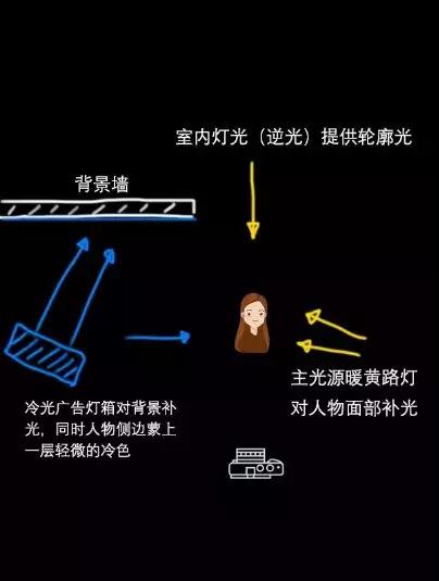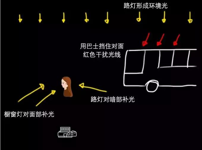 利用暖黃的路燈作為主光源給人物補(bǔ)光,室內(nèi)出來(lái)的燈(逆光)提供輪廓光。整個(gè)畫(huà)面就更有戲劇性。