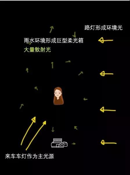 ?下面這一組,同樣是車(chē)燈作為主光源,路燈提供環(huán)境光,而雨水則形成天然的柔光箱,使整個(gè)大環(huán)境看成是一個(gè)均勻光。
