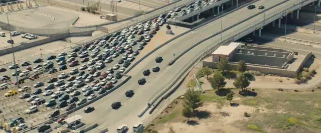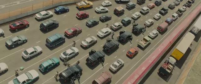 AC:電影前20分鐘是一段非常有沖擊力的片段,Emily Blunt飾演的角色和她的隊(duì)伍開(kāi)進(jìn)華雷斯(邊境城市)。這個(gè)片段里混合航拍鏡頭和在車(chē)上的鏡頭,展現(xiàn)他們?cè)竭^(guò)邊境