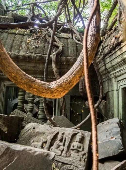 崩密列是吳哥窟公認(rèn)最神秘的寺廟,崩密列的歷史還處于不明狀態(tài),據(jù)學(xué)者推測大約建造于 11 世紀(jì)末至 12 世紀(jì)初,宮崎駿電影《天空之城》的原型,古寺搭配樹木、青苔、落葉建構(gòu)出唯美的意象。整個寺廟嚴(yán)重崩塌,石頭落了一地沒有任何保護(hù),感覺人人都可以撿走,被叢林層層覆蓋千年,各種被封死的的門,似乎里面隱藏著大秘密。
