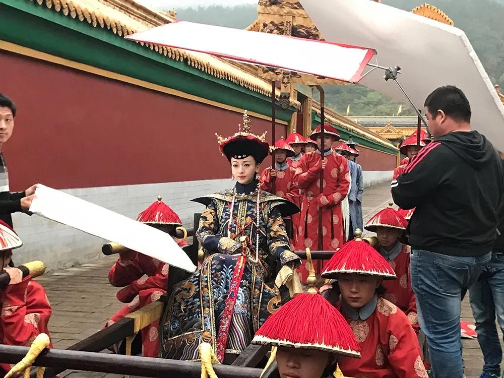 左下方這塊反光板,是用來(lái)減小鼻頭下面,眼眶下面,下巴下面的陰影的。上面那塊紅色邊的柔光片,是用來(lái)讓天光又能穿過(guò),又能變得柔和你。后邊那塊大型的,是弱弱地給魏瓔珞一個(gè)逆光光邊,讓她區(qū)別于背景的。