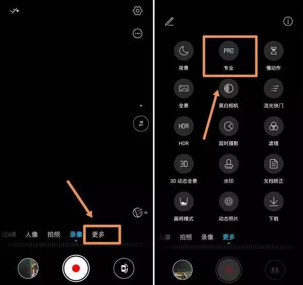 打開相機后,在主界面下面有個“更多”,我們點擊后界面上就會多出許多選項,第二個就是“專業(yè)”模式(各個型號的專業(yè)模式方法開啟來不一樣,大家如果找不到,可自行搜索自己手機的打開方式)。