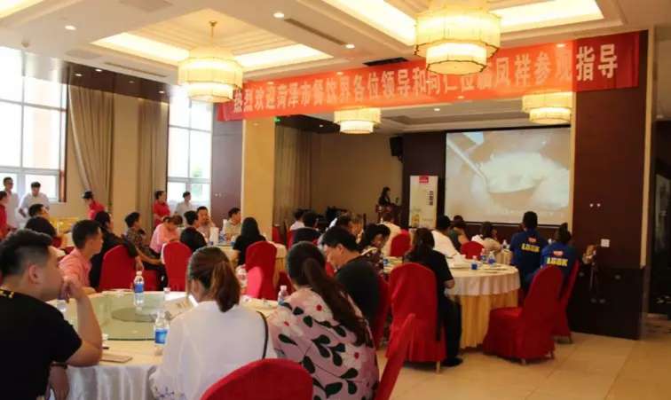 (菏澤旅游飯店協(xié)會(huì)考察團(tuán)一行觀看風(fēng)祥食品生產(chǎn)影像片)