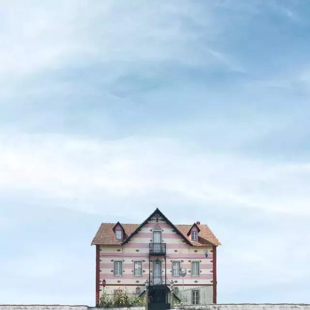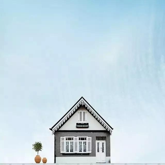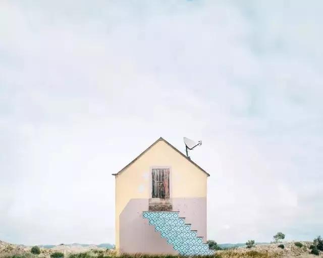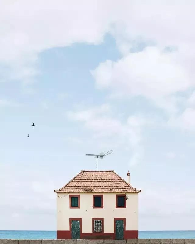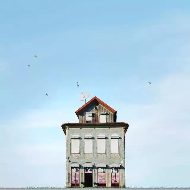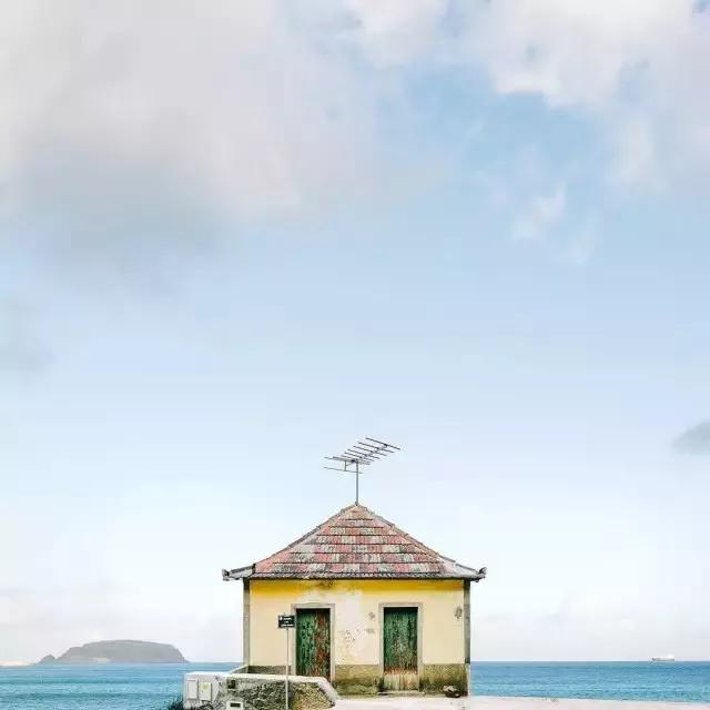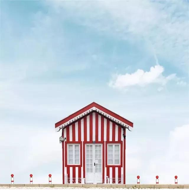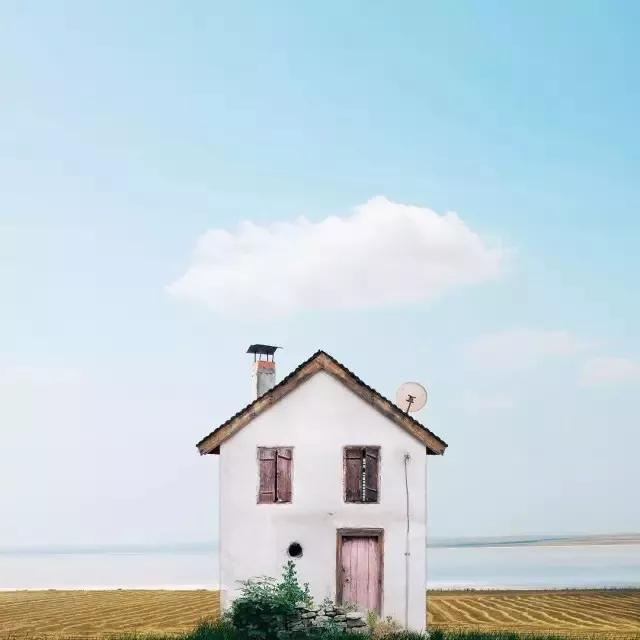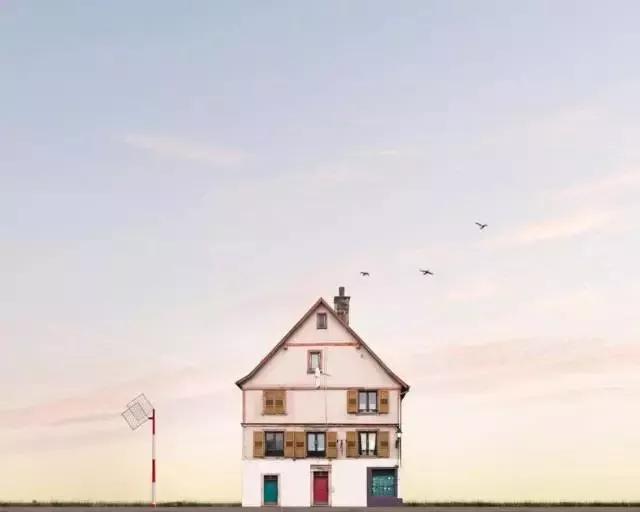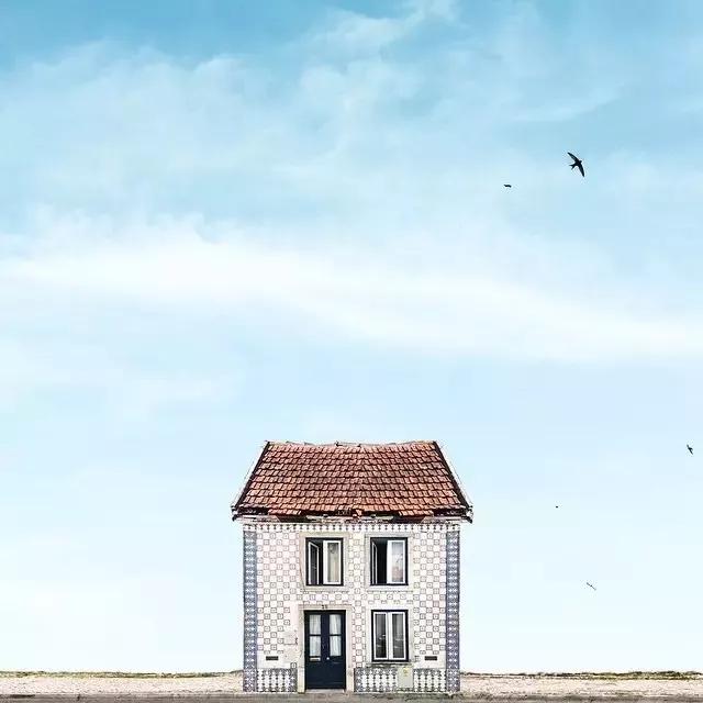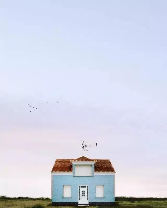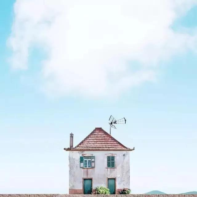 他的拍攝風(fēng)格統(tǒng)一,偏愛(ài)極簡(jiǎn)構(gòu)圖,多以藍(lán)天白云為背景,畫面的主角則是一座小房子。