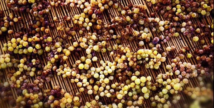 和意大利圣酒在室內(nèi)慢慢脫水?dāng)?shù)月不同,這里的葡萄直接被置于陽(yáng)光下晾曬12-14天,脫水后進(jìn)行破碎壓榨,糖分、酸度風(fēng)味物質(zhì)都極為濃縮。