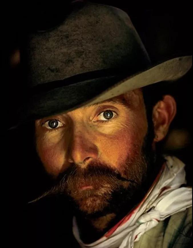 人像通常使用柔光拍攝,這樣可以令模特放松,柔化紋理,并讓模特的眼睛產(chǎn)生交流。在這張令人難忘的人像作品中,光線扮演了主角,將觀眾的視線引至牛仔的雙眼,光線來自側面,剛剛能夠照亮牛仔的帽子,對高光區(qū)曝光,而非陰影區(qū)。