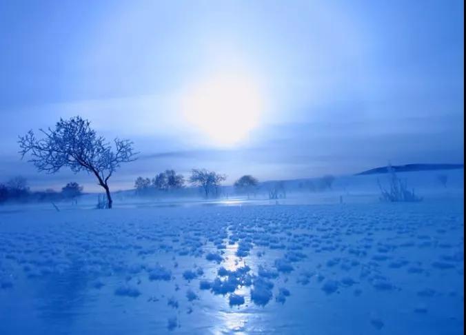 攝影師的這幅風景作品以出色的冷調(diào)藍色而成功。照片中的每一處都透露著冬季、和平、安靜的意味。早晨,逆光中的冰原,結冰的河面上有很多不知名的小草小樹,清晨的寒霧籠罩著他們,雖然太陽被云層遮擋,但畫面卻呈現(xiàn)出一種神圣與美麗。
