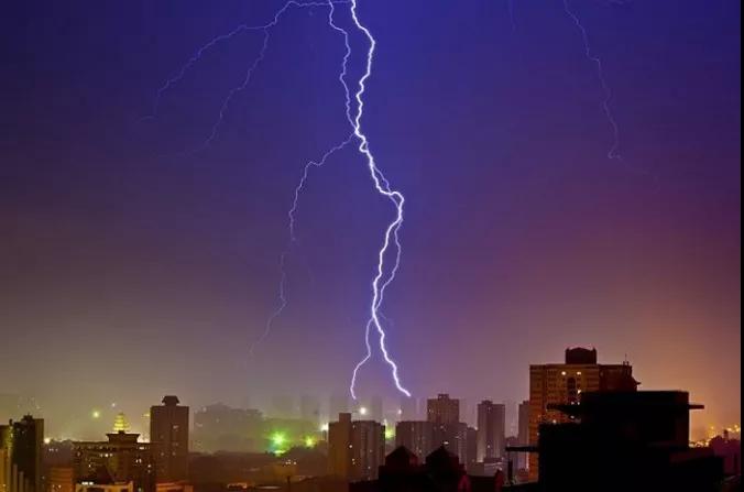 在這張照片里,攝影師很巧妙的捕捉到了閃電,天空的藍色和城市燈光所暈染出的紫色給照片蒙上了一種怪異的感覺。