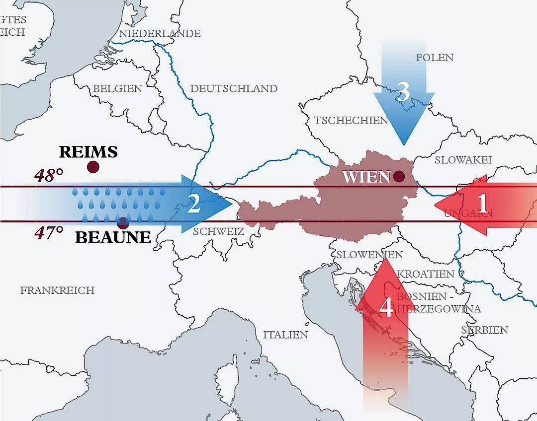 1.大陸性氣候;2.溫和的大西洋氣候;3.北部冷空氣;4.地中海氣候