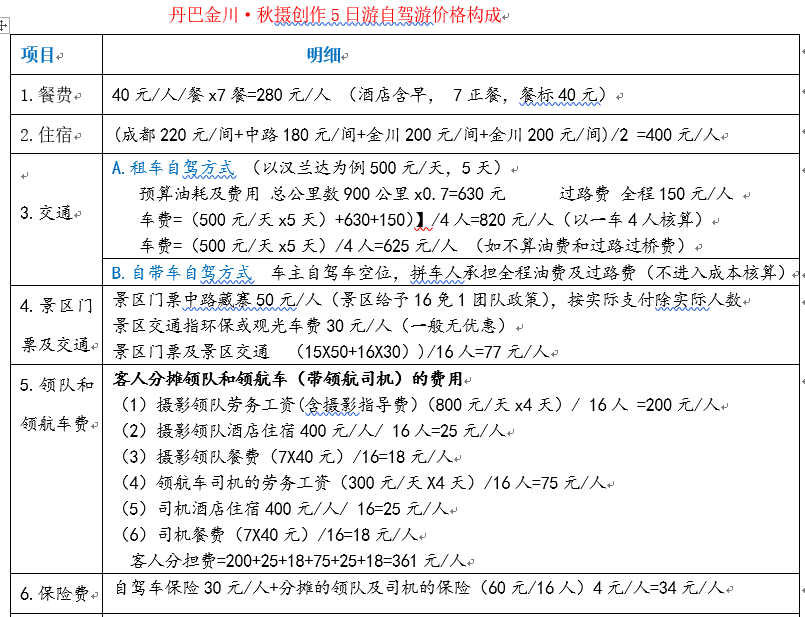 四川康輝國(guó)際旅行社有限公司與首汽集團(tuán)聯(lián)合打造的“丹巴金川·秋攝創(chuàng)作5日游”就是跟團(tuán)自駕游。跟團(tuán)自駕游產(chǎn)品一般都是設(shè)計(jì)的主題旅游產(chǎn)品,產(chǎn)品由活動(dòng)介紹、活動(dòng)亮點(diǎn)、行程安排、費(fèi)用、出發(fā)時(shí)間、集合地點(diǎn)、用車說明、溫馨提示、租車說明等內(nèi)容構(gòu)成。