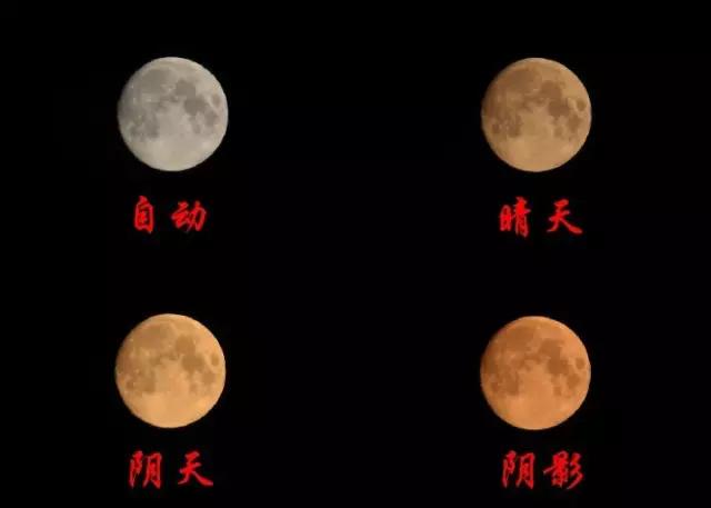 自動白平衡,月亮很白;晴天白平衡,月亮微黃;陰天白平衡,月亮很黃;陰影白平衡,月亮不僅黃,而且發(fā)紅。