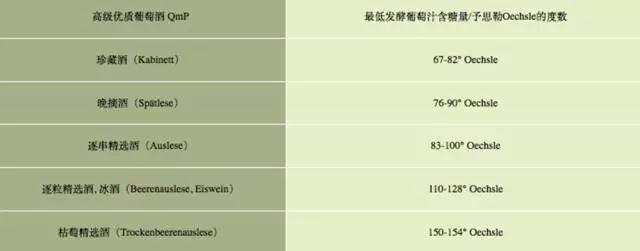 其最低含糖量的標(biāo)準(zhǔn)用予思勒(Oechsle)來(lái)表示,一度予思勒表明一升葡萄汁比一升水重一克,具體標(biāo)準(zhǔn)如下(其范圍是因?yàn)楦鳟a(chǎn)區(qū)標(biāo)準(zhǔn)不一):