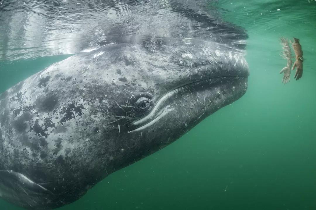 一頭好奇的灰鯨正在游向一位游客從水面游覽艇上伸下來(lái)的手。墨西哥下加利福尼亞半島中部地區(qū)圣伊格納西奧湖,灰鯨母親和她們的孩子們都會(huì)很積極的尋求和人類的接觸,讓人們撓一下自己的頭或者后背。
