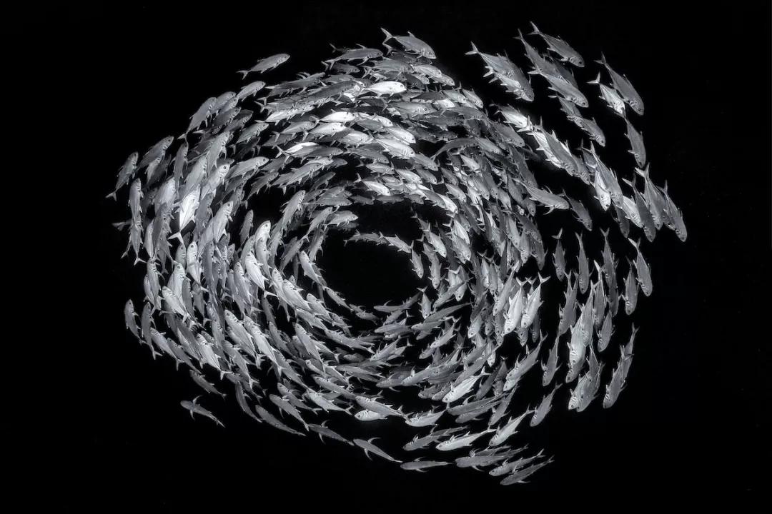 一大群六帶鲹在水里組成了環(huán)狀,它們這一行為是交配前的約會(huì)練習(xí),同時(shí)還可以威嚇一下潛在捕食者。像這樣的聚會(huì)產(chǎn)卵很容易被捕漁者一鍋端,但幸運(yùn)的是,這群魚生活在紅海禁止捕漁的海洋保護(hù)區(qū)域內(nèi)。