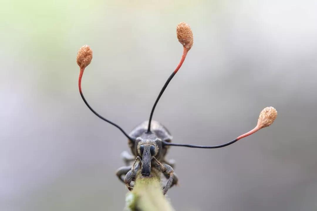攝影師 Frank 在夜探秘魯亞馬遜熱帶雨林時(shí),發(fā)現(xiàn)了這只緊緊抓著蕨類植物根部,長(zhǎng)相奇異的象鼻蟲。它呆滯的眼睛顯示著它已經(jīng)死亡了,而從它軀干上長(zhǎng)出的三根觸角一樣的東西則是一種寄生在象鼻蟲身上的真菌。