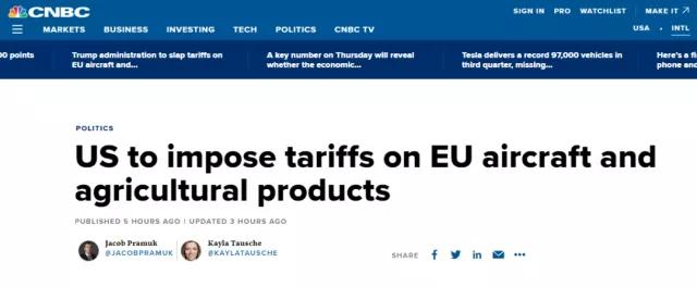 近日,美國(guó)政府對(duì)歐洲多類(lèi)產(chǎn)品征收25%的關(guān)稅,共計(jì)征收75億美元(相當(dāng)于69億歐元,在WTO歷史上創(chuàng)紀(jì)錄的)的新關(guān)稅。以報(bào)復(fù)波音公司和空客公司之間的爭(zhēng)端,并稱這是對(duì)歐洲對(duì)空客補(bǔ)貼長(zhǎng)期貿(mào)易戰(zhàn)的回應(yīng)。