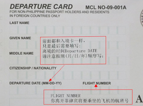 中國公民在結束菲律賓觀光旅游,于機場辦理出境登機手續(xù)前,應先交納機場稅,然后到訂購返機票的航空公司柜臺前辦理出境登機手續(xù),領取登機卡和行李卡,同時向航空公司工作人員遞交出境卡。出境卡的填寫內(nèi)容同入境卡基本相同。