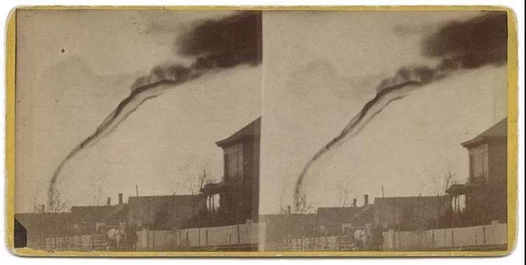 目前最早可知的龍卷風(fēng)照片是在美國堪薩斯州拍到的。1884 年4 月26 日,一陣龍卷風(fēng)緩慢地刮過堪薩斯州的安德森縣,這給了業(yè)余攝影師A.A. 亞當(dāng)斯(A.A. Adams)設(shè)置他箱式相機的機會和時間。