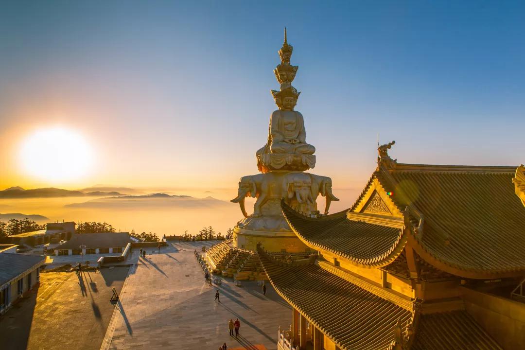 金頂擁有全世界最大的禮佛廣場,在這里你可以朝拜48米高的【十方普賢】,與如織游人一起進殿朝拜禮佛,披著金色日光與佛光交織而成的袈裟,體會全球最雄偉的佛教銅象的神圣和莊嚴;或是順著那清幽的羊腸小道,感受“一山有四季,十里不同天”的自然景色;還可以在舍身崖俯瞰川西平原的優(yōu)美風光,領閱一覽眾山小、風光無限好的意境;