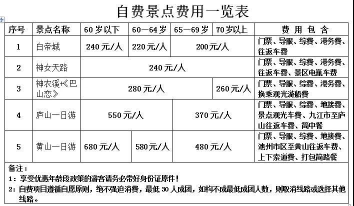 2、自費(fèi)項(xiàng)目遵循自愿原則、絕不強(qiáng)迫消費(fèi),不參加自費(fèi)項(xiàng)目的游客可在指定地點(diǎn)自由活動(dòng),等參加自費(fèi)的游客返回后一同前往下一站;