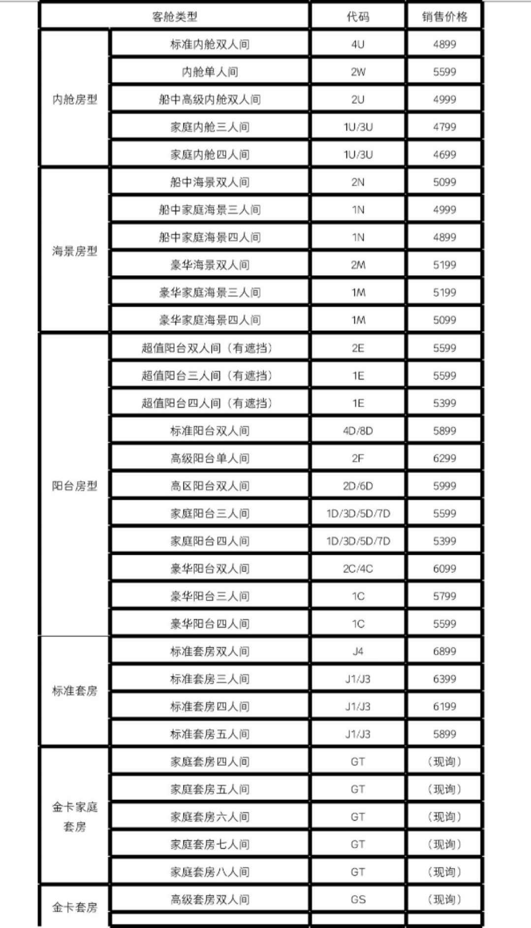1、艙位價格詳情: