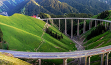 果子溝大橋在設(shè)計施工中秉承"以最小限度破壞、最大限度的恢復(fù)"的環(huán)保理念,在克服地質(zhì)災(zāi)害頻發(fā)影響通行的同時,邊施工邊進(jìn)行環(huán)?;謴?fù)工作。建成的大橋橋身與果子溝的美景渾然一體,將為果子溝國家級風(fēng)景區(qū)再添一道美麗風(fēng)景線。