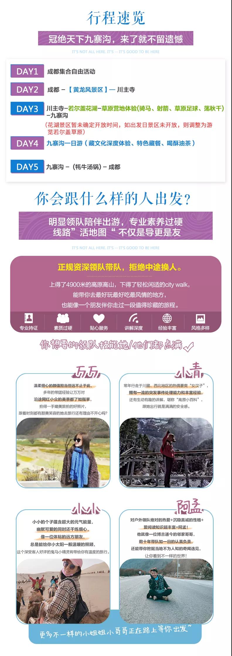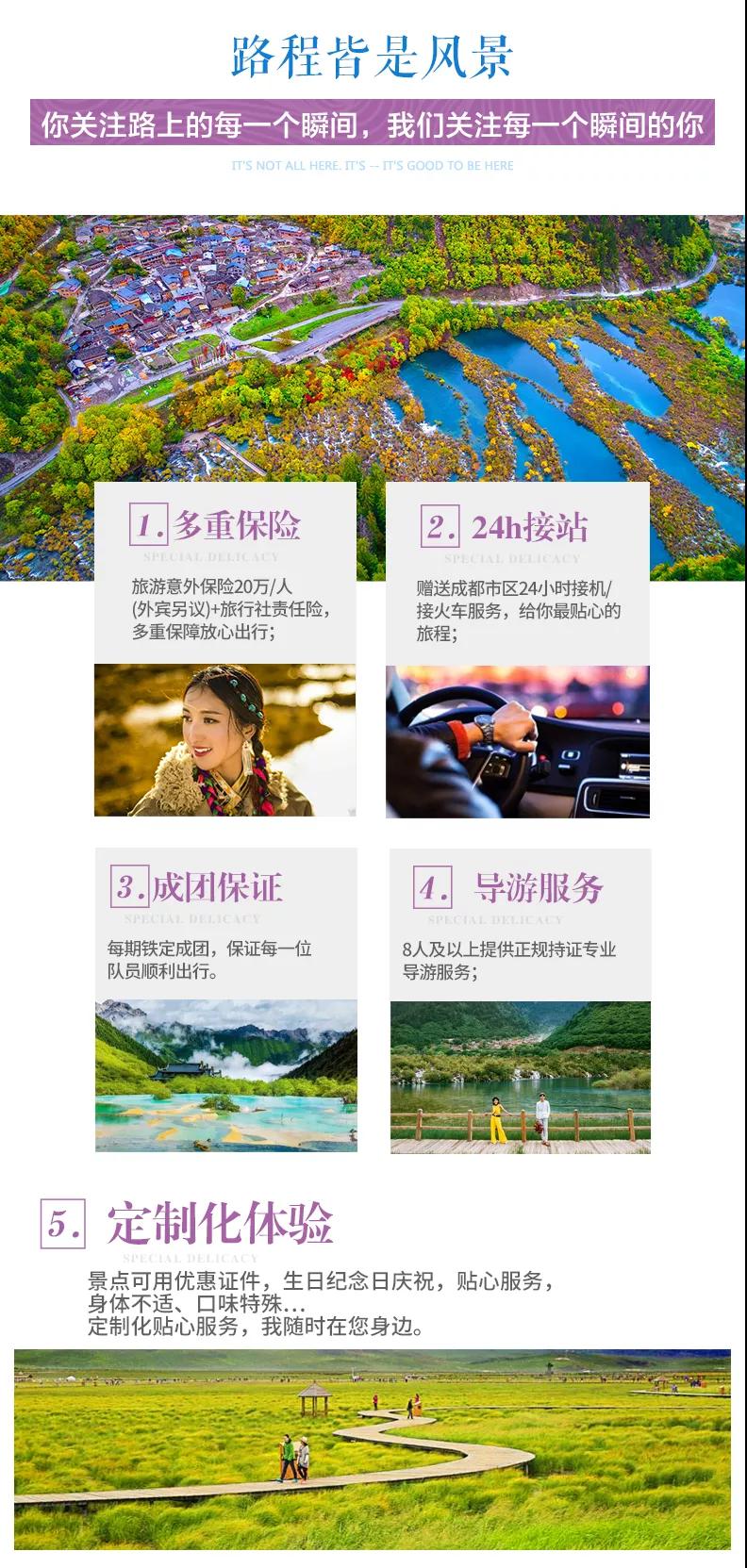 3、九寨溝面積較大游客需求不一,因此主要以游客自助游形式游覽,如無導(dǎo)游陪同望您諒解。游覽開始前導(dǎo)游會與您約定好集合時(shí)間,請務(wù)必按時(shí)到達(dá)指定地點(diǎn),避免耽誤大家接下來的行程;