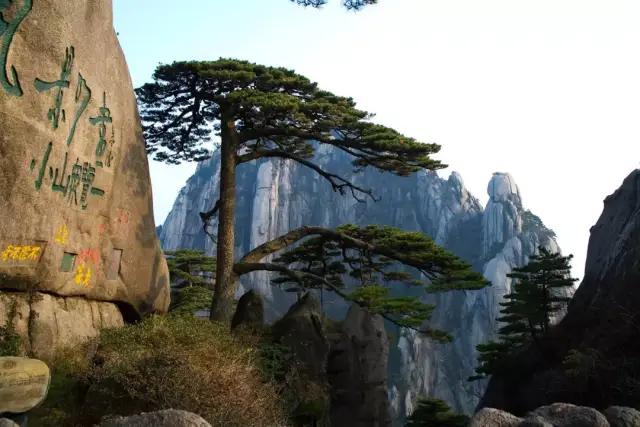 黃山原名“黟山”,因峰巖青黑,遙望蒼黛而名。后因傳說軒轅黃帝曾在此煉丹,故改名為“黃山”。黃山代表景觀有“五絕三瀑”,五絕:奇松、怪石、云海、溫泉、冬雪;三瀑:人字瀑、百丈泉、九龍瀑。黃山迎客松是安徽人民熱情友好的象征,承載著擁抱世界的東方禮儀文化。