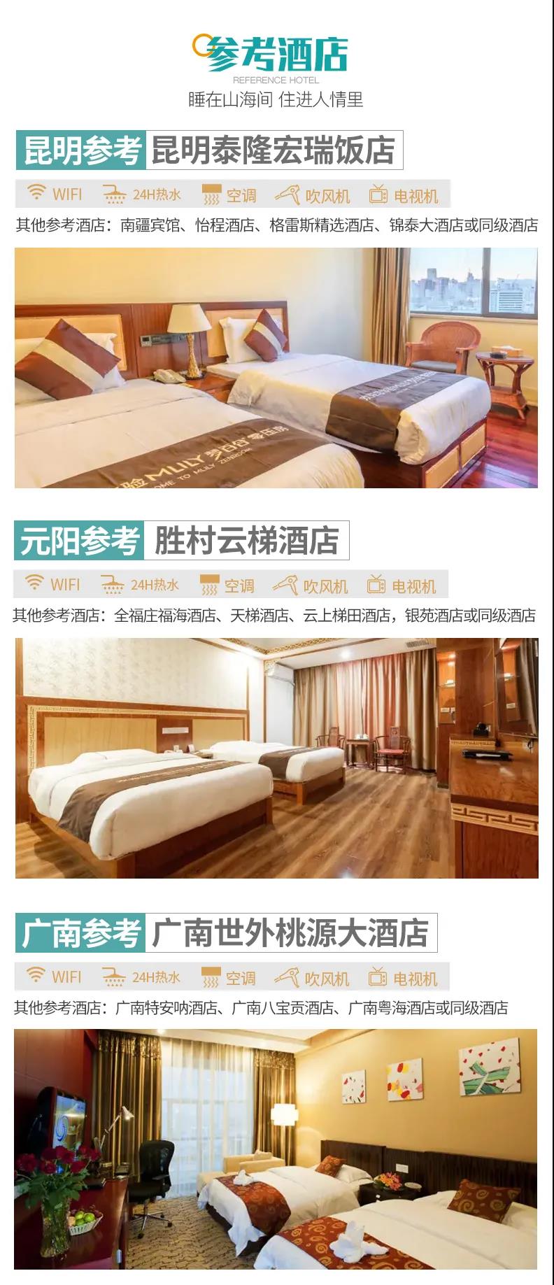 住宿 :行程所列7晚當(dāng)?shù)鼐频陿?biāo)間,并贈送集合日昆明四星酒店一晚。元陽景區(qū)酒店標(biāo)間2晚、廣南準(zhǔn)四酒店1晚、彌勒準(zhǔn)四星酒店標(biāo)間1晚、羅平縣三星酒店1晚、普者黑景區(qū)精品客棧或酒店1晚(景區(qū)內(nèi)住宿均為攝影農(nóng)家客棧標(biāo)準(zhǔn)間,不帶星級;因沿途條件有限,如酒店設(shè)施達(dá)不到您的期望,請您諒解)