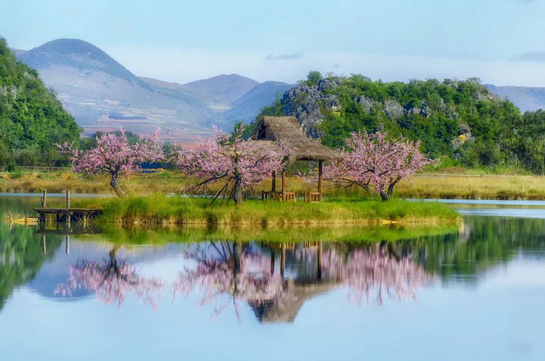 吃完早餐之后我們出發(fā)前往熱播劇《三生三世十里桃花》的實景拍攝地【菜花箐村】看最美的“小桂林”景致,三生緣起,靜待花期;灼灼桃夭、十里芳華。漫山遍野的“桃花”仙境,這便是上神折顏的避世之處。小橋,孤峰,桃花島…在湖水的倒映下美得特別不真實,恍若人間仙境,置身其中仿佛人在畫中游。