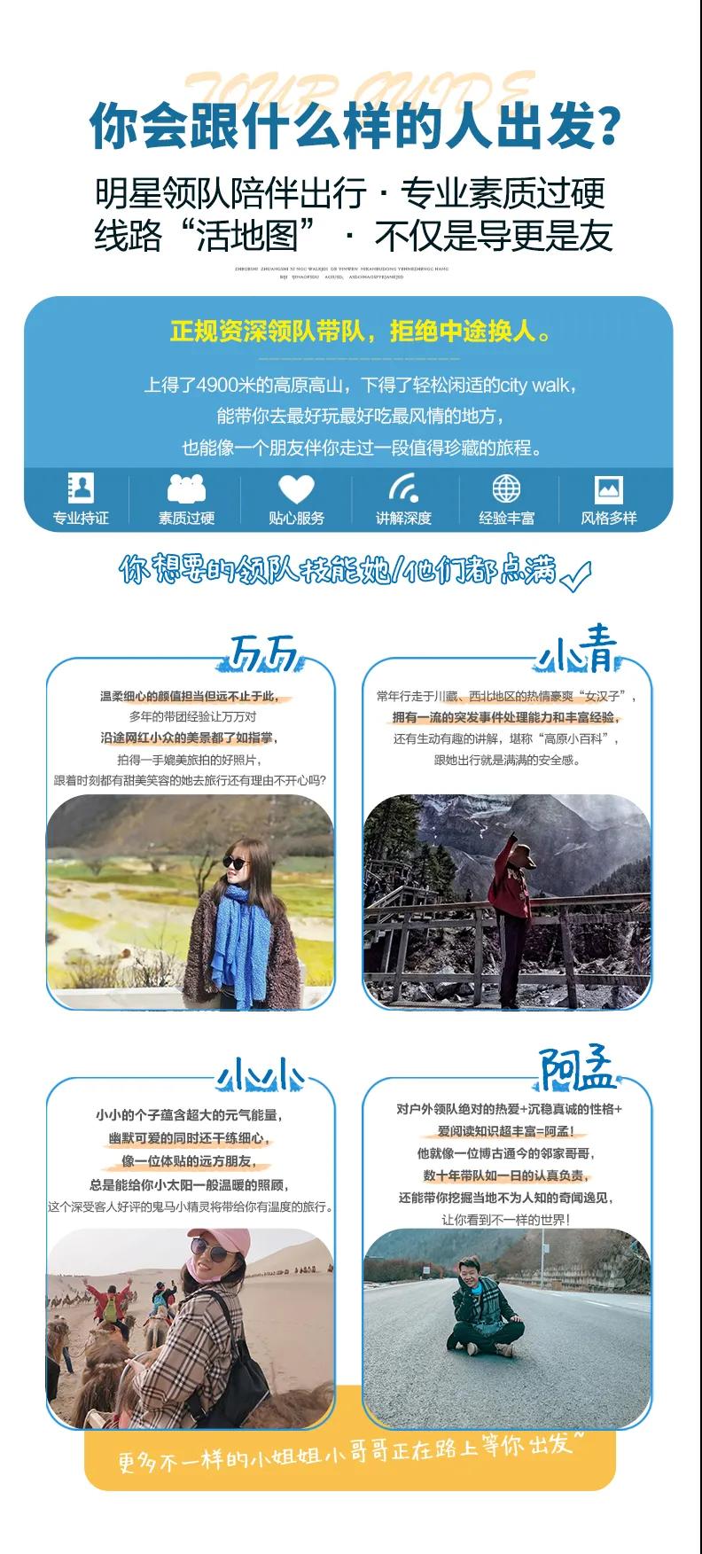 7、導(dǎo)游服務(wù):8人及以上提供正規(guī)持證專業(yè)導(dǎo)游服務(wù);8人以下,由經(jīng)驗豐富的司機提供向?qū)Х?wù)。