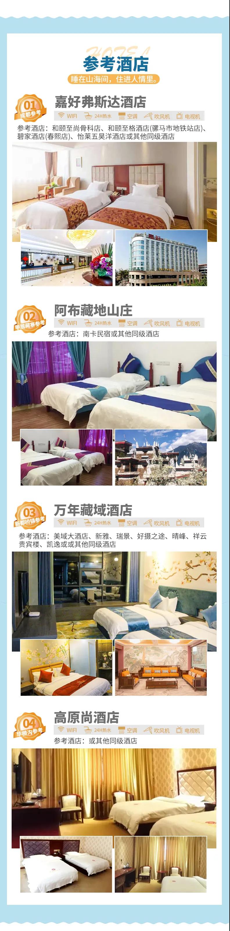 4、住宿:含全程5天4晚舒適酒店,確保酒店干凈衛(wèi)生,溫馨舒適。因沿途高原藏區(qū)條件有限,如果酒店設(shè)施沒有達到您的期望,敬請諒解。參考酒店如下(僅供參考,實際以訂房為準):