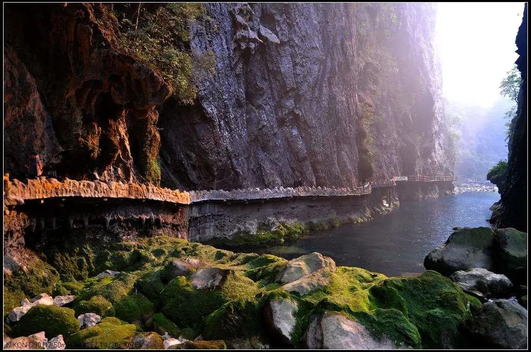 下午:后乘車前往游覽國家AAAAA級景區(qū)【大七孔】(游玩時間不少于2小時);大七孔是以原始森林、峽谷、伏流、地下湖為主體的景區(qū),沿著恐怖峽打狗河直下,可見吊橋,右邊的棧道一面靠山,一邊臨水,蜿蜒曲折,凹凸不平。最為震撼的還是走過棧道的三分之二處,有一橫跨河兩岸的天然巨巖,是喀斯特是貌奇觀之一,俗稱天生橋,被專家們譽為“大自然神力所塑的東方凱旋門”,仰觀橋孔下,只見巨型鐘乳懸掛,橋腳、橋側(cè)的裂隙石縫長出綠石草叢灌木,藤蘿花卉纏裹橋身,真是滿目琳瑯、五顏六色的天然大彩橋。
