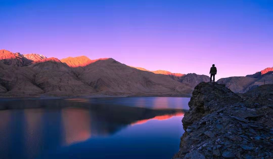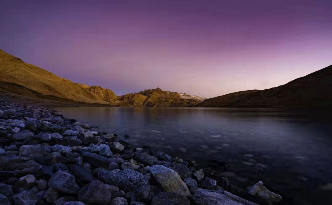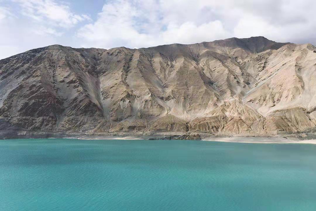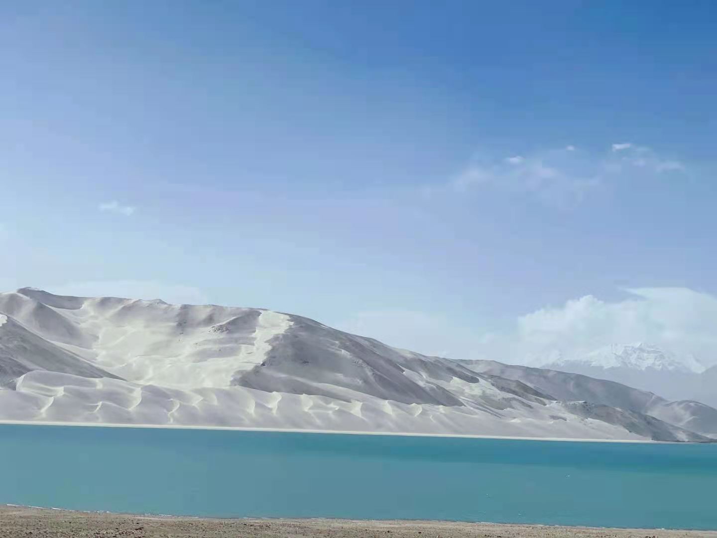 車子行進(jìn)在海拔三千多米的【蓋孜峽谷】中??龉废褚粭l玉帶,沿著蓋孜河在蓋孜峽谷中穿梭著,眼前的景色又變成了綿延不絕的荒山雪嶺。此時突然出現(xiàn)的美麗湖泊便是【布倫口白沙湖】湖水在帕米爾高原潔靜的陽光下,閃耀著金屬般的光澤。湖水在天空、白沙和雪山的綜合作用下呈現(xiàn)出一種別樣的藍(lán)。