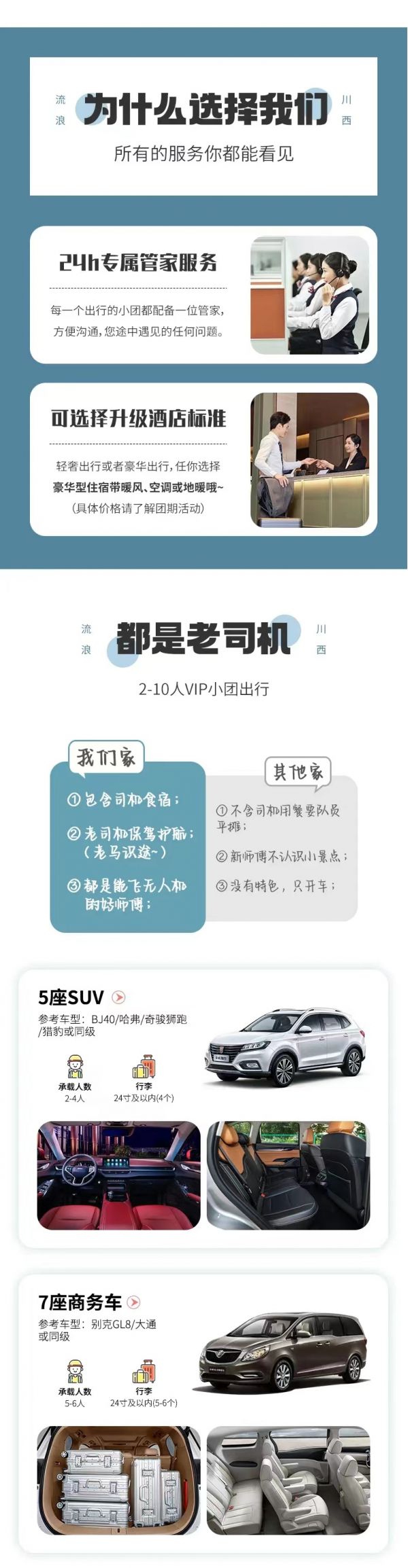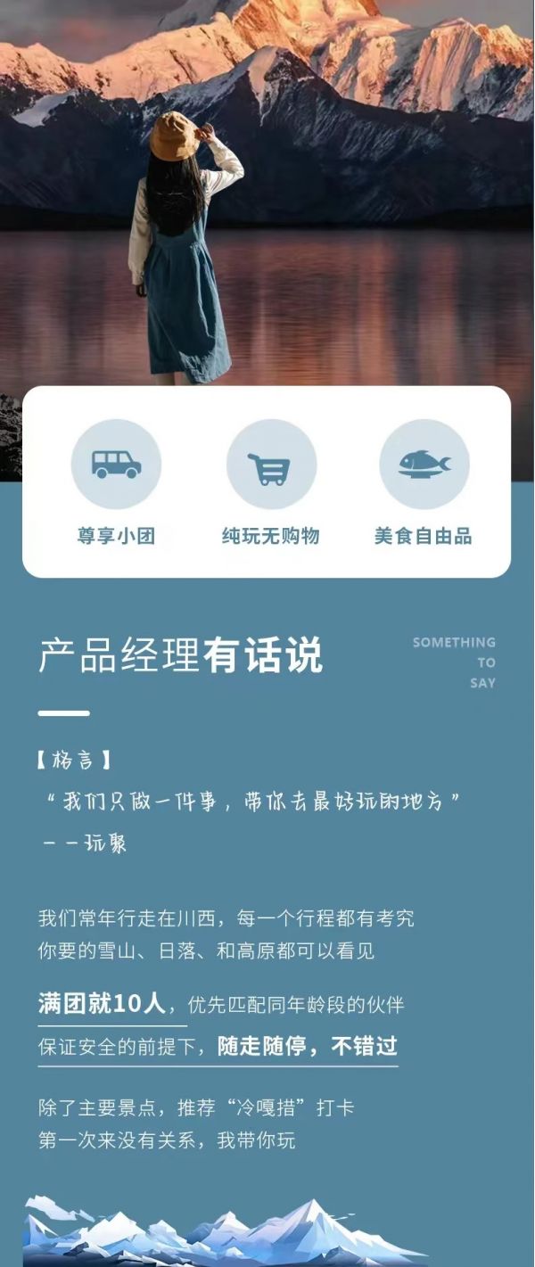 私人訂制:我們業(yè)務(wù)范圍囊括了全國(guó)各大城市,川西、西北、新疆、西藏,在路上永遠(yuǎn)有我們的身影。我們將為每一個(gè)有定制需求的你策劃出獨(dú)屬于自己的完美旅行。