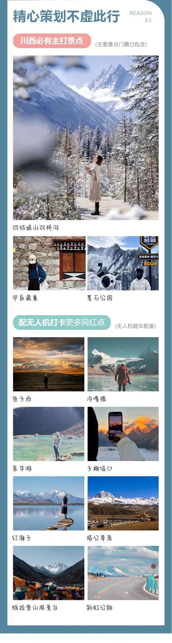 紅海子+魚(yú)子西+月亮湖+冷嘎措+墨石公園+雅拉雪山觀景臺(tái)+甲居藏寨+四姑娘山+雙橋溝?
