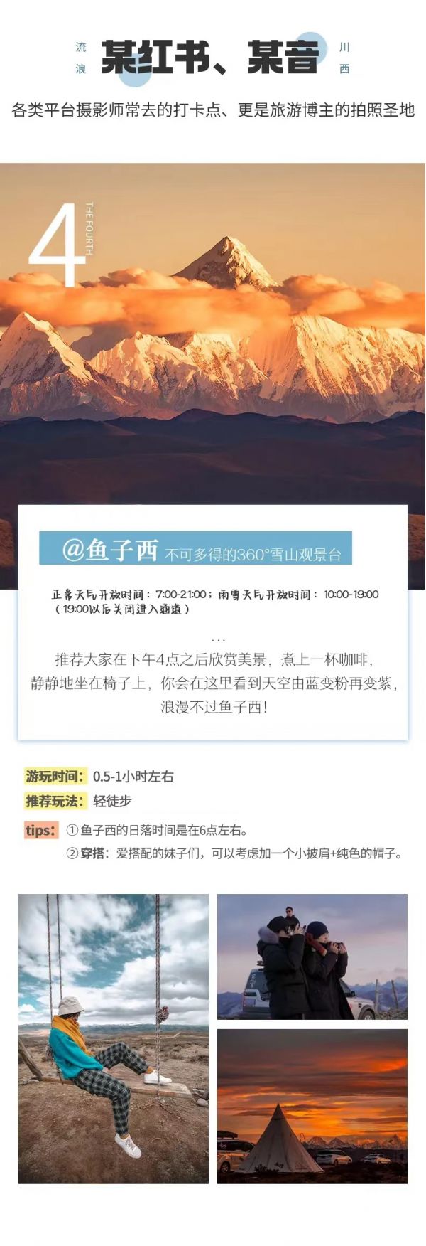 繼續(xù)前行來(lái)到魚(yú)子西,在這里你可以感受日照金山的壯闊, 也可以和雅拉雪山來(lái)一次近距離的合影,還可以遠(yuǎn)眺貢嘎雪山和云海。夜深了,還能看到肉眼可見(jiàn)的星空和銀河。