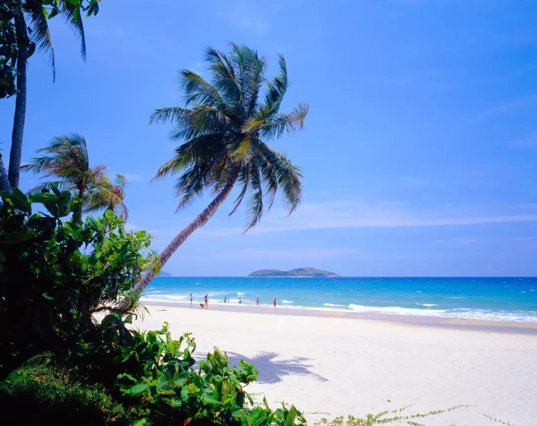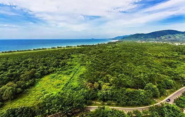 灣內(nèi)植被繁茂,有大片椰林、橡膠等熱帶作物,椰樹檳榔,相映成趣。白沙碧海,藍(lán)天流云,自成畫卷,更有青梅翠帶,溪流湖泊,秀嶼奇石,細(xì)浪柔沙,美不勝收。