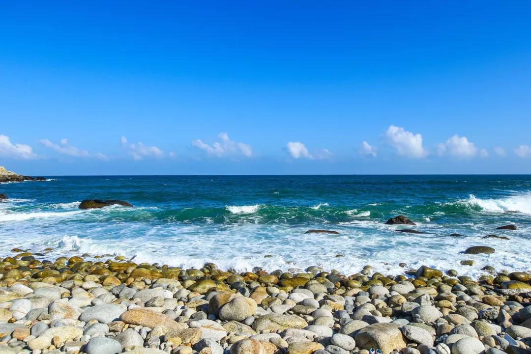 這里弓狀的數(shù)百米長的海灘上,沒有潔白的沙帶,人臨此境,首先內(nèi)陸到湛藍(lán)的海水,再是密密麻麻的卵石。