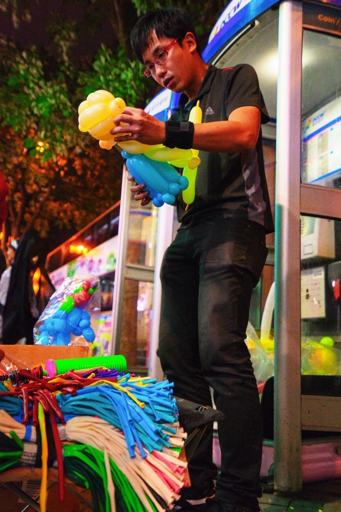 主角登場。這位小哥憑借靈巧的雙手,無與倫比的迅捷,以及來圖即興創(chuàng)作的本領(lǐng)俘獲了無數(shù)膝蓋,當然還有花花綠綠的港幣。這是真本事,比旁邊那個不停做重復扭動狀靠photo me來賺錢的歐吉桑有技術(shù)含量的多。在這“路邊攤”旁,我終于體會了一把好整以暇等待的愜意,而不用和老板一起提心吊膽、張皇四望,時刻準備著為一句“城管來啦”而百米沖刺。
