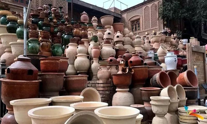 2、花盆巴扎喀什古城城門南側(cè),是花盆巴扎,巴扎入口處是彩陶墻,琳瑯滿目的陶器,讓人贊嘆不已??κ餐撂找脖环Q為“泥巴藝術(shù)”,器型主要以碗、碟、盤、壺等生活器具為主。(“巴扎”是維吾爾語,翻譯過來是集市的意思。)