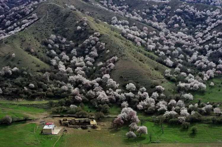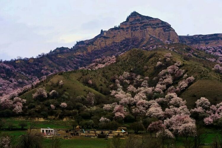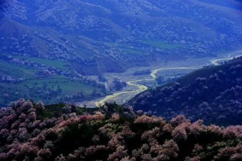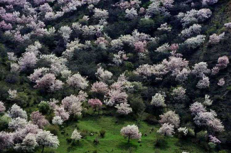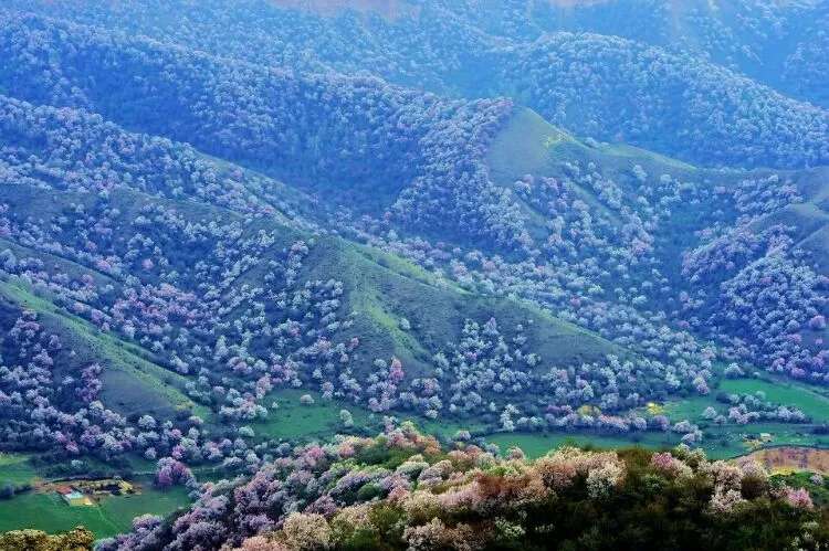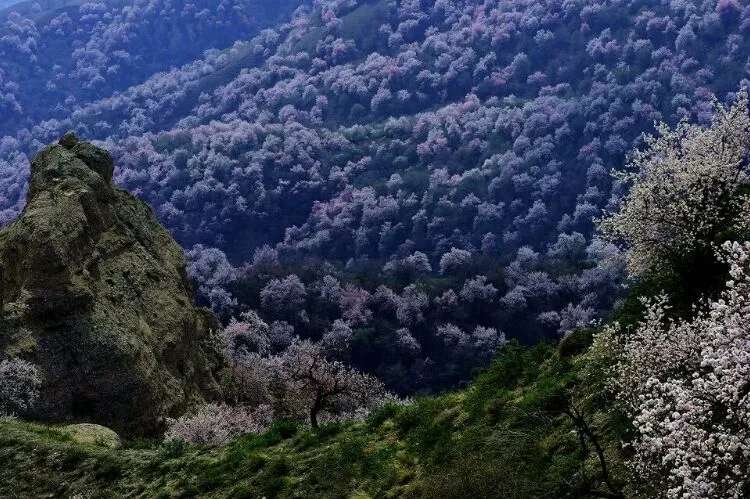 早春三月, 霍城縣大西溝福壽山景區(qū)杏花盛開,景色迷人,春花爛漫,香艷滿枝的時候,紅 蘭 粉 紫 白 各色鮮花含苞吐蕊,爭相齊放,滿山遍野,姹紫嫣紅,秋天紅葉鋪滿山腰,碩果掛滿枝頭,碧野在著名的《天山景物記》中記敘這樣的場景:“春天繁花開遍峽谷,秋天果實(shí)壓滿山腰,每當(dāng)花紅果熟,正是鳥雀百獸的樂園”寫的正是大西溝。