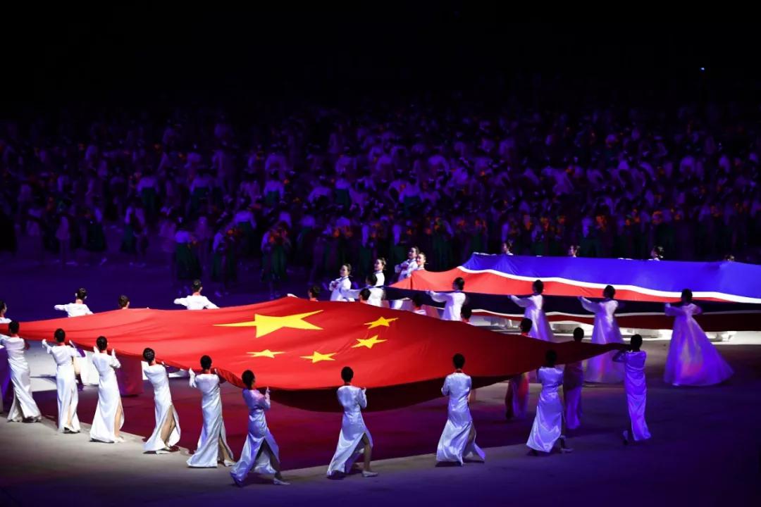 當(dāng)?shù)貢r間晚9時40分許,習(xí)近平和夫人彭麗媛在金正恩和夫人李雪主陪同下,來到體育場主席臺。在場觀眾全體起立,以熱烈的掌聲和歡呼聲,歡迎中國貴賓的到來。