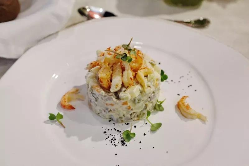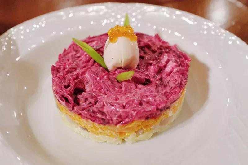 在海外傳播最廣的俄式料理非紅菜湯莫屬,即我們熟悉的羅宋湯。紅菜湯最早起源于烏克蘭,隨著俄羅斯文化傳入中國后,卻變成了另一個(gè)版本。大多數(shù)紅菜湯都不放甜菜,而是加大量番茄和土豆。真正的紅菜湯要保留甜菜鮮艷的紫紅色,湯底則用牛肉經(jīng)久熬成,需清澈入味,然后撒入新鮮蒔蘿,最后澆上一勺酸奶油才算完成。經(jīng)典款前菜是生腌鯡魚沙拉,一種是鯡魚切片搭配土豆,脂肪感滿滿,帶有濃郁的咸腥味和一點(diǎn)酸味。若想再狂野一些,不如來份牛舌沙拉,搭配小龍蝦是點(diǎn)睛之筆,兩樣看起來風(fēng)馬牛不相及的東西,居然完美融合。另一種版本顏值更高,吃起來也輕松許多,鯡魚、甜菜、土豆、胡蘿卜等都切粒后,一層層疊起來,變成色彩斑斕的圓柱形,澆上色拉醬,味道立刻小清新了。主菜不用說,罐燜牛肉會(huì)是最保險(xiǎn)的選擇,各種香料和肉塊一起慢慢煨燉,直到香濃爛酥,濃濃的醬汁配上土豆、胡蘿卜等蔬菜一起吃,絕對是一道非常符合東方胃的西式菜。