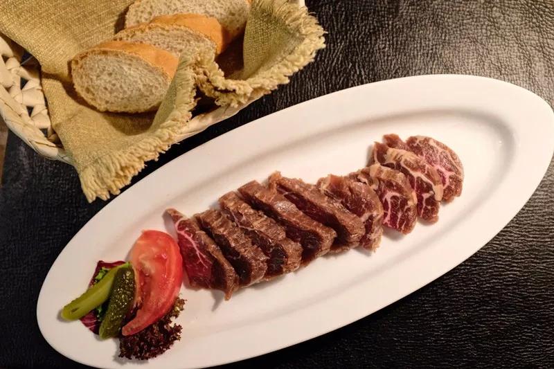 換個(gè)角度看,相比被各種加工食品和農(nóng)藥蔬菜包圍的我們,西伯利亞土著們的飲食才是純正的有機(jī)天然,無需繁復(fù)的烹飪手段和調(diào)味方式,自然的即是最美味。在新西伯利亞市最熱門的Puppenhaus餐廳,一道擺盤極其簡陋的煙熏生腌牛肉令人回味無窮。牛肉厚切,脂肪與瘦肉的比例恰到好處,肉質(zhì)柔軟緊實(shí),微微呈紅褐色的肉片發(fā)出迷人的光澤,煙熏的風(fēng)味沒有濃烈到臘香的程度,而帶有果木的清香。