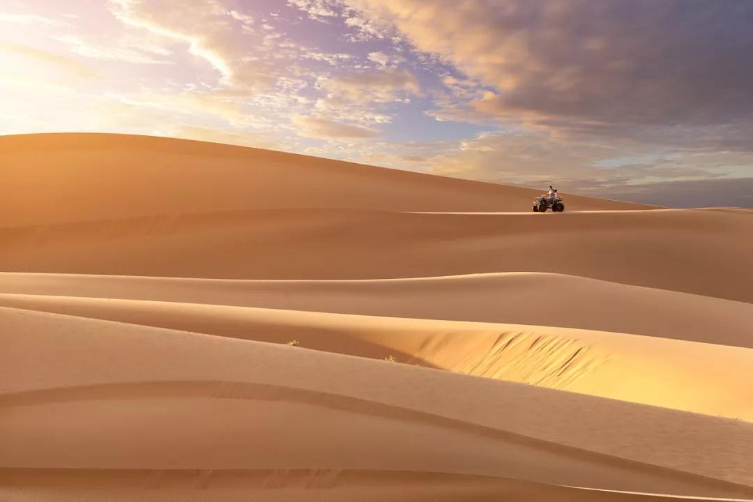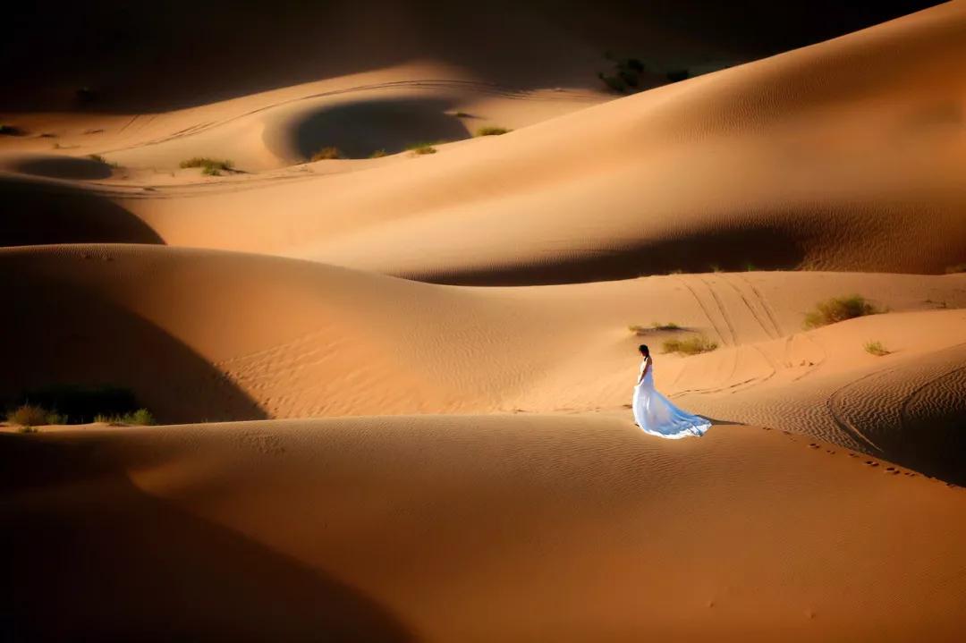 陽光灑下,沙漠變成金黃,與落日相依相伴,那一刻遙望遠方,覺得自己是如此的渺小,大自然的震撼,是發(fā)自內心的贊嘆。