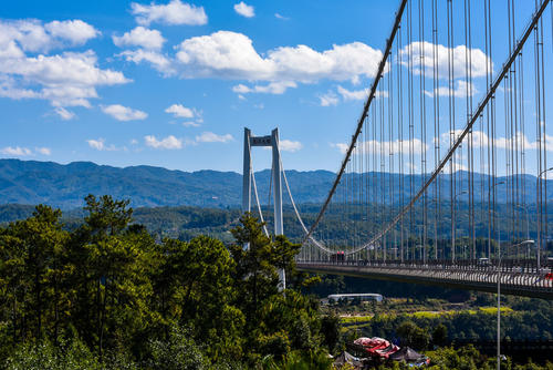 【龍江特大橋】亞洲最長(zhǎng)的高速公路懸索橋——云南保山高速公路龍江特大橋,跨越龍陵縣龍江鄉(xiāng)上邦煥村與騰沖縣五合鄉(xiāng)大丙弄村之間的龍川江河谷,大橋全長(zhǎng)2470.58米,保山岸索塔高度為169.688米,騰沖岸索塔高度為129.703米,橋面離江面280米,主跨長(zhǎng)為1196米,成為目前亞洲最大的懸索橋;